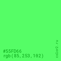 Цвет #55FD66 в цветовой модели RGB обозначается тремя октетами (85, 253, 102) в десятичном формате и #55FD66 в шестнадцатиричном (hex) формате, которые являются интенсивностью красного 85 (hex 55), интенсивность зелёного 253 (hex FD) и интенсивность синего 102 (hex 66).