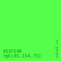 Цвет #55FE4B в цветовой модели RGB обозначается тремя октетами (85, 254, 75) в десятичном формате и #55FE4B в шестнадцатиричном (hex) формате, которые являются интенсивностью красного 85 (hex 55), интенсивность зелёного 254 (hex FE) и интенсивность синего 75 (hex 4B).