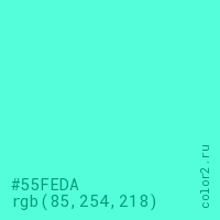 Цвет #55FEDA в цветовой модели RGB обозначается тремя октетами (85, 254, 218) в десятичном формате и #55FEDA в шестнадцатиричном (hex) формате, которые являются интенсивностью красного 85 (hex 55), интенсивность зелёного 254 (hex FE) и интенсивность синего 218 (hex DA).