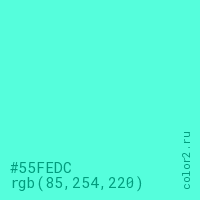 Цвет #55FEDC в цветовой модели RGB обозначается тремя октетами (85, 254, 220) в десятичном формате и #55FEDC в шестнадцатиричном (hex) формате, которые являются интенсивностью красного 85 (hex 55), интенсивность зелёного 254 (hex FE) и интенсивность синего 220 (hex DC).