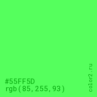 Цвет #55FF5D в цветовой модели RGB обозначается тремя октетами (85, 255, 93) в десятичном формате и #55FF5D в шестнадцатиричном (hex) формате, которые являются интенсивностью красного 85 (hex 55), интенсивность зелёного 255 (hex FF) и интенсивность синего 93 (hex 5D).