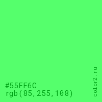 Цвет #55FF6C в цветовой модели RGB обозначается тремя октетами (85, 255, 108) в десятичном формате и #55FF6C в шестнадцатиричном (hex) формате, которые являются интенсивностью красного 85 (hex 55), интенсивность зелёного 255 (hex FF) и интенсивность синего 108 (hex 6C).