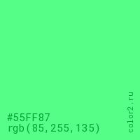 Цвет #55FF87 в цветовой модели RGB обозначается тремя октетами (85, 255, 135) в десятичном формате и #55FF87 в шестнадцатиричном (hex) формате, которые являются интенсивностью красного 85 (hex 55), интенсивность зелёного 255 (hex FF) и интенсивность синего 135 (hex 87).