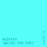 Цвет #55FFF9 в цветовой модели RGB обозначается тремя октетами (85, 255, 249) в десятичном формате и #55FFF9 в шестнадцатиричном (hex) формате, которые являются интенсивностью красного 85 (hex 55), интенсивность зелёного 255 (hex FF) и интенсивность синего 249 (hex F9).