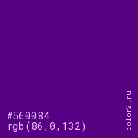 Цвет #560084 в цветовой модели RGB обозначается тремя октетами (86, 0, 132) в десятичном формате и #560084 в шестнадцатиричном (hex) формате, которые являются интенсивностью красного 86 (hex 56), интенсивность зелёного 0 (hex 00) и интенсивность синего 132 (hex 84).