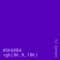 Цвет #5600BA в цветовой модели RGB обозначается тремя октетами (86, 0, 186) в десятичном формате и #5600BA в шестнадцатиричном (hex) формате, которые являются интенсивностью красного 86 (hex 56), интенсивность зелёного 0 (hex 00) и интенсивность синего 186 (hex BA).