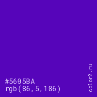 Цвет #5605BA в цветовой модели RGB обозначается тремя октетами (86, 5, 186) в десятичном формате и #5605BA в шестнадцатиричном (hex) формате, которые являются интенсивностью красного 86 (hex 56), интенсивность зелёного 5 (hex 05) и интенсивность синего 186 (hex BA).