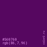 Цвет #560760 в цветовой модели RGB обозначается тремя октетами (86, 7, 96) в десятичном формате и #560760 в шестнадцатиричном (hex) формате, которые являются интенсивностью красного 86 (hex 56), интенсивность зелёного 7 (hex 07) и интенсивность синего 96 (hex 60).