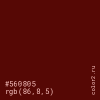 Цвет #560805 в цветовой модели RGB обозначается тремя октетами (86, 8, 5) в десятичном формате и #560805 в шестнадцатиричном (hex) формате, которые являются интенсивностью красного 86 (hex 56), интенсивность зелёного 8 (hex 08) и интенсивность синего 5 (hex 05).