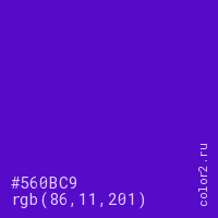 Цвет #560BC9 в цветовой модели RGB обозначается тремя октетами (86, 11, 201) в десятичном формате и #560BC9 в шестнадцатиричном (hex) формате, которые являются интенсивностью красного 86 (hex 56), интенсивность зелёного 11 (hex 0B) и интенсивность синего 201 (hex C9).