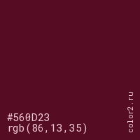 Цвет #560D23 в цветовой модели RGB обозначается тремя октетами (86, 13, 35) в десятичном формате и #560D23 в шестнадцатиричном (hex) формате, которые являются интенсивностью красного 86 (hex 56), интенсивность зелёного 13 (hex 0D) и интенсивность синего 35 (hex 23).