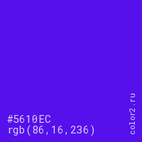 Цвет #5610EC в цветовой модели RGB обозначается тремя октетами (86, 16, 236) в десятичном формате и #5610EC в шестнадцатиричном (hex) формате, которые являются интенсивностью красного 86 (hex 56), интенсивность зелёного 16 (hex 10) и интенсивность синего 236 (hex EC).