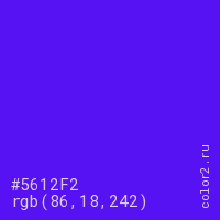 Цвет #5612F2 в цветовой модели RGB обозначается тремя октетами (86, 18, 242) в десятичном формате и #5612F2 в шестнадцатиричном (hex) формате, которые являются интенсивностью красного 86 (hex 56), интенсивность зелёного 18 (hex 12) и интенсивность синего 242 (hex F2).