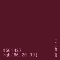 Цвет #561427 в цветовой модели RGB обозначается тремя октетами (86, 20, 39) в десятичном формате и #561427 в шестнадцатиричном (hex) формате, которые являются интенсивностью красного 86 (hex 56), интенсивность зелёного 20 (hex 14) и интенсивность синего 39 (hex 27).