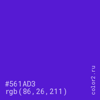 Цвет #561AD3 в цветовой модели RGB обозначается тремя октетами (86, 26, 211) в десятичном формате и #561AD3 в шестнадцатиричном (hex) формате, которые являются интенсивностью красного 86 (hex 56), интенсивность зелёного 26 (hex 1A) и интенсивность синего 211 (hex D3).