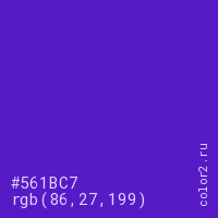 Цвет #561BC7 в цветовой модели RGB обозначается тремя октетами (86, 27, 199) в десятичном формате и #561BC7 в шестнадцатиричном (hex) формате, которые являются интенсивностью красного 86 (hex 56), интенсивность зелёного 27 (hex 1B) и интенсивность синего 199 (hex C7).