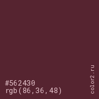 Цвет #562430 в цветовой модели RGB обозначается тремя октетами (86, 36, 48) в десятичном формате и #562430 в шестнадцатиричном (hex) формате, которые являются интенсивностью красного 86 (hex 56), интенсивность зелёного 36 (hex 24) и интенсивность синего 48 (hex 30).