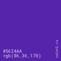 Цвет #5624AA в цветовой модели RGB обозначается тремя октетами (86, 36, 170) в десятичном формате и #5624AA в шестнадцатиричном (hex) формате, которые являются интенсивностью красного 86 (hex 56), интенсивность зелёного 36 (hex 24) и интенсивность синего 170 (hex AA).