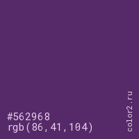 Цвет #562968 в цветовой модели RGB обозначается тремя октетами (86, 41, 104) в десятичном формате и #562968 в шестнадцатиричном (hex) формате, которые являются интенсивностью красного 86 (hex 56), интенсивность зелёного 41 (hex 29) и интенсивность синего 104 (hex 68).