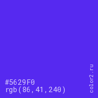 Цвет #5629F0 в цветовой модели RGB обозначается тремя октетами (86, 41, 240) в десятичном формате и #5629F0 в шестнадцатиричном (hex) формате, которые являются интенсивностью красного 86 (hex 56), интенсивность зелёного 41 (hex 29) и интенсивность синего 240 (hex F0).