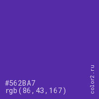 Цвет #562BA7 в цветовой модели RGB обозначается тремя октетами (86, 43, 167) в десятичном формате и #562BA7 в шестнадцатиричном (hex) формате, которые являются интенсивностью красного 86 (hex 56), интенсивность зелёного 43 (hex 2B) и интенсивность синего 167 (hex A7).