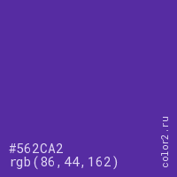 Цвет #562CA2 в цветовой модели RGB обозначается тремя октетами (86, 44, 162) в десятичном формате и #562CA2 в шестнадцатиричном (hex) формате, которые являются интенсивностью красного 86 (hex 56), интенсивность зелёного 44 (hex 2C) и интенсивность синего 162 (hex A2).