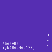 Цвет #562EB2 в цветовой модели RGB обозначается тремя октетами (86, 46, 178) в десятичном формате и #562EB2 в шестнадцатиричном (hex) формате, которые являются интенсивностью красного 86 (hex 56), интенсивность зелёного 46 (hex 2E) и интенсивность синего 178 (hex B2).