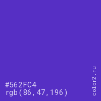 Цвет #562FC4 в цветовой модели RGB обозначается тремя октетами (86, 47, 196) в десятичном формате и #562FC4 в шестнадцатиричном (hex) формате, которые являются интенсивностью красного 86 (hex 56), интенсивность зелёного 47 (hex 2F) и интенсивность синего 196 (hex C4).