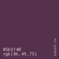 Цвет #56314B в цветовой модели RGB обозначается тремя октетами (86, 49, 75) в десятичном формате и #56314B в шестнадцатиричном (hex) формате, которые являются интенсивностью красного 86 (hex 56), интенсивность зелёного 49 (hex 31) и интенсивность синего 75 (hex 4B).