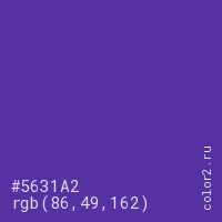 Цвет #5631A2 в цветовой модели RGB обозначается тремя октетами (86, 49, 162) в десятичном формате и #5631A2 в шестнадцатиричном (hex) формате, которые являются интенсивностью красного 86 (hex 56), интенсивность зелёного 49 (hex 31) и интенсивность синего 162 (hex A2).
