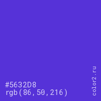 Цвет #5632D8 в цветовой модели RGB обозначается тремя октетами (86, 50, 216) в десятичном формате и #5632D8 в шестнадцатиричном (hex) формате, которые являются интенсивностью красного 86 (hex 56), интенсивность зелёного 50 (hex 32) и интенсивность синего 216 (hex D8).