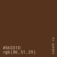 Цвет #56331D в цветовой модели RGB обозначается тремя октетами (86, 51, 29) в десятичном формате и #56331D в шестнадцатиричном (hex) формате, которые являются интенсивностью красного 86 (hex 56), интенсивность зелёного 51 (hex 33) и интенсивность синего 29 (hex 1D).