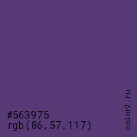 Цвет #563975 в цветовой модели RGB обозначается тремя октетами (86, 57, 117) в десятичном формате и #563975 в шестнадцатиричном (hex) формате, которые являются интенсивностью красного 86 (hex 56), интенсивность зелёного 57 (hex 39) и интенсивность синего 117 (hex 75).