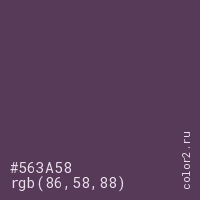 Цвет #563A58 в цветовой модели RGB обозначается тремя октетами (86, 58, 88) в десятичном формате и #563A58 в шестнадцатиричном (hex) формате, которые являются интенсивностью красного 86 (hex 56), интенсивность зелёного 58 (hex 3A) и интенсивность синего 88 (hex 58).