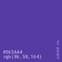 Цвет #563AA4 в цветовой модели RGB обозначается тремя октетами (86, 58, 164) в десятичном формате и #563AA4 в шестнадцатиричном (hex) формате, которые являются интенсивностью красного 86 (hex 56), интенсивность зелёного 58 (hex 3A) и интенсивность синего 164 (hex A4).