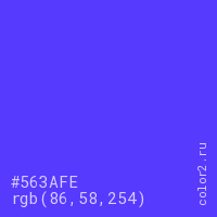 Цвет #563AFE в цветовой модели RGB обозначается тремя октетами (86, 58, 254) в десятичном формате и #563AFE в шестнадцатиричном (hex) формате, которые являются интенсивностью красного 86 (hex 56), интенсивность зелёного 58 (hex 3A) и интенсивность синего 254 (hex FE).