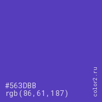 Цвет #563DBB в цветовой модели RGB обозначается тремя октетами (86, 61, 187) в десятичном формате и #563DBB в шестнадцатиричном (hex) формате, которые являются интенсивностью красного 86 (hex 56), интенсивность зелёного 61 (hex 3D) и интенсивность синего 187 (hex BB).