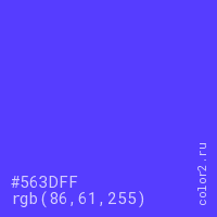 Цвет #563DFF в цветовой модели RGB обозначается тремя октетами (86, 61, 255) в десятичном формате и #563DFF в шестнадцатиричном (hex) формате, которые являются интенсивностью красного 86 (hex 56), интенсивность зелёного 61 (hex 3D) и интенсивность синего 255 (hex FF).
