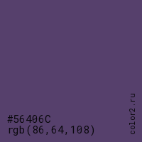 Цвет #56406C в цветовой модели RGB обозначается тремя октетами (86, 64, 108) в десятичном формате и #56406C в шестнадцатиричном (hex) формате, которые являются интенсивностью красного 86 (hex 56), интенсивность зелёного 64 (hex 40) и интенсивность синего 108 (hex 6C).