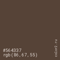 Цвет #564337 в цветовой модели RGB обозначается тремя октетами (86, 67, 55) в десятичном формате и #564337 в шестнадцатиричном (hex) формате, которые являются интенсивностью красного 86 (hex 56), интенсивность зелёного 67 (hex 43) и интенсивность синего 55 (hex 37).