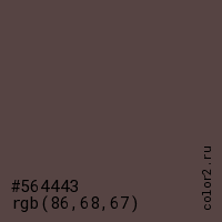 Цвет #564443 в цветовой модели RGB обозначается тремя октетами (86, 68, 67) в десятичном формате и #564443 в шестнадцатиричном (hex) формате, которые являются интенсивностью красного 86 (hex 56), интенсивность зелёного 68 (hex 44) и интенсивность синего 67 (hex 43).