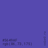 Цвет #5649AF в цветовой модели RGB обозначается тремя октетами (86, 73, 175) в десятичном формате и #5649AF в шестнадцатиричном (hex) формате, которые являются интенсивностью красного 86 (hex 56), интенсивность зелёного 73 (hex 49) и интенсивность синего 175 (hex AF).