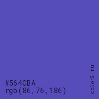 Цвет #564CBA в цветовой модели RGB обозначается тремя октетами (86, 76, 186) в десятичном формате и #564CBA в шестнадцатиричном (hex) формате, которые являются интенсивностью красного 86 (hex 56), интенсивность зелёного 76 (hex 4C) и интенсивность синего 186 (hex BA).