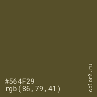 Цвет #564F29 в цветовой модели RGB обозначается тремя октетами (86, 79, 41) в десятичном формате и #564F29 в шестнадцатиричном (hex) формате, которые являются интенсивностью красного 86 (hex 56), интенсивность зелёного 79 (hex 4F) и интенсивность синего 41 (hex 29).