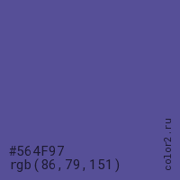 Цвет #564F97 в цветовой модели RGB обозначается тремя октетами (86, 79, 151) в десятичном формате и #564F97 в шестнадцатиричном (hex) формате, которые являются интенсивностью красного 86 (hex 56), интенсивность зелёного 79 (hex 4F) и интенсивность синего 151 (hex 97).
