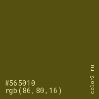 Цвет #565010 в цветовой модели RGB обозначается тремя октетами (86, 80, 16) в десятичном формате и #565010 в шестнадцатиричном (hex) формате, которые являются интенсивностью красного 86 (hex 56), интенсивность зелёного 80 (hex 50) и интенсивность синего 16 (hex 10).