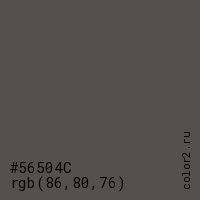 Цвет #56504C в цветовой модели RGB обозначается тремя октетами (86, 80, 76) в десятичном формате и #56504C в шестнадцатиричном (hex) формате, которые являются интенсивностью красного 86 (hex 56), интенсивность зелёного 80 (hex 50) и интенсивность синего 76 (hex 4C).