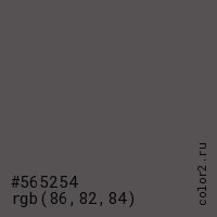 Цвет #565254 в цветовой модели RGB обозначается тремя октетами (86, 82, 84) в десятичном формате и #565254 в шестнадцатиричном (hex) формате, которые являются интенсивностью красного 86 (hex 56), интенсивность зелёного 82 (hex 52) и интенсивность синего 84 (hex 54).