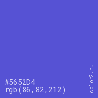 Цвет #5652D4 в цветовой модели RGB обозначается тремя октетами (86, 82, 212) в десятичном формате и #5652D4 в шестнадцатиричном (hex) формате, которые являются интенсивностью красного 86 (hex 56), интенсивность зелёного 82 (hex 52) и интенсивность синего 212 (hex D4).