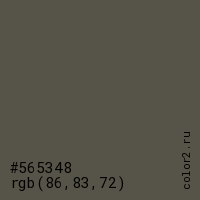 Цвет #565348 в цветовой модели RGB обозначается тремя октетами (86, 83, 72) в десятичном формате и #565348 в шестнадцатиричном (hex) формате, которые являются интенсивностью красного 86 (hex 56), интенсивность зелёного 83 (hex 53) и интенсивность синего 72 (hex 48).
